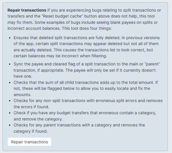 If you are experiencing bugs relating to split transactions or transfers and the "Reset budget cache" button above does not help, this tool may fix them.